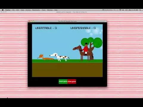 the formal concerns in this text-sound piece grew out of our engagement with sound art, academic computer music, and popular film. in this work we tell the story as much through text as through artificially created rooms for the voice, surround positioning, and enhanced speech melody. many of the non-vocal sounds in the piece are created from high-resolution recordings and processing of two mbiras (used in our prelude to the hunt), a fox whistle (used to lure a fox in the hunt), and recordings of foxes themselves used in the 5.1 mix. the audio for this piece was produced at 48khz/24 bit resolution. the hypertext pages are designed to mirror the narrative leaps and vocal spatialization in the sound piece. the online game "foxhunt" is styled after early home video game systems.